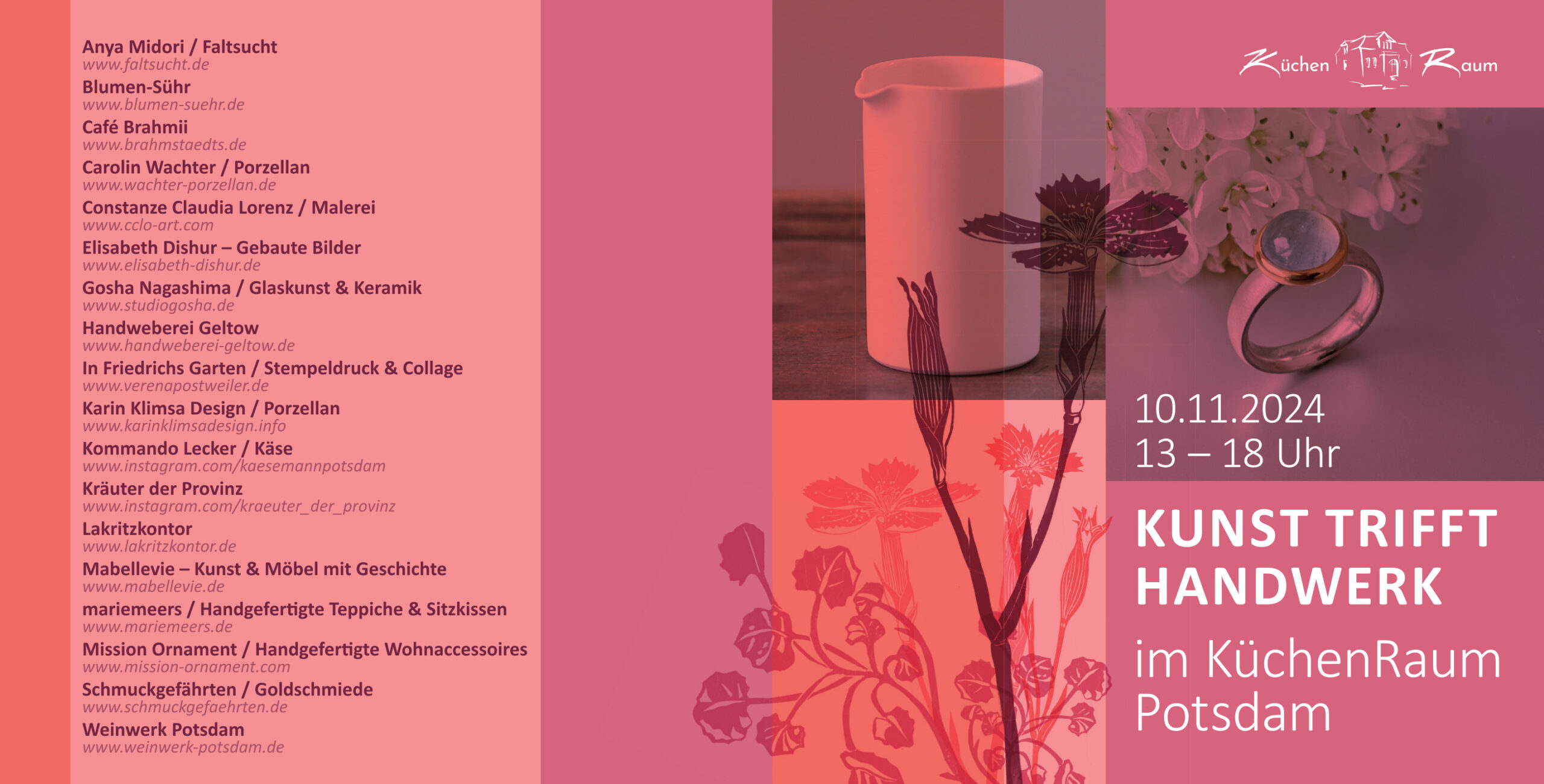 10. November 202413 – 18 Uhr Wir laden Sie am Sonntag, den 10. November 2024 herzlich zu uns in den KüchenRaum ein. Im Rahmen unserer aktuellen Kunstausstellung Flamingoflug der Malerin Constanze Claudia Lorenz werden von 13 bis 18 Uhr die Räumlichkeiten unserer charmanten Villa von zahlreichen Ausstellern aus dem...
